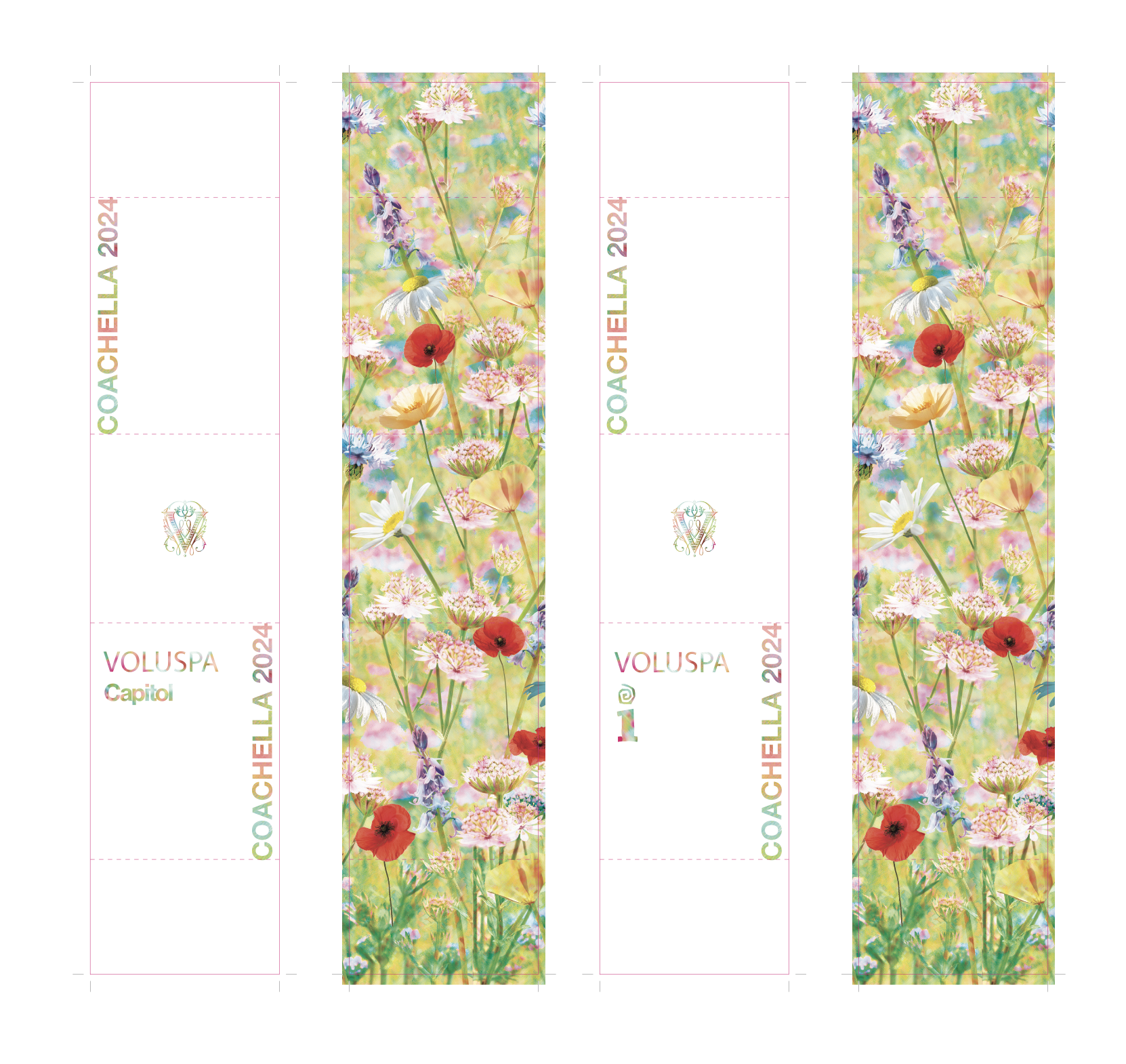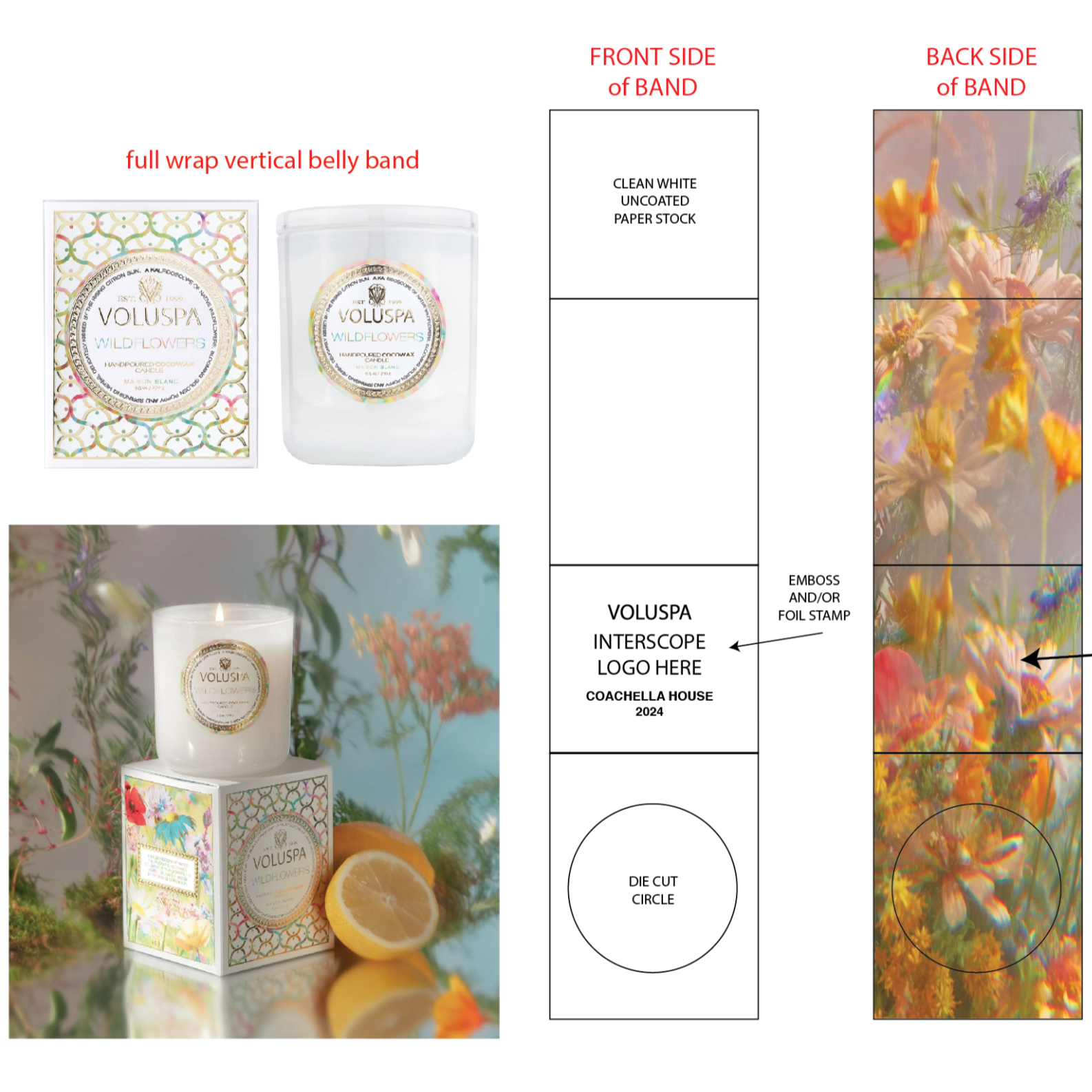 I designed a double sided sleeve using pearlecent stock to give the print and etherial look and feel. The outside of the sleeve highlighted the brand partnerships, the inside and was flooded with the “Wildflowers” iconic fragrance pattern. The final look resulted in a cohesive and clean look while still keeping the original decorative packaging of Voluspa’s Wildflowers candle.