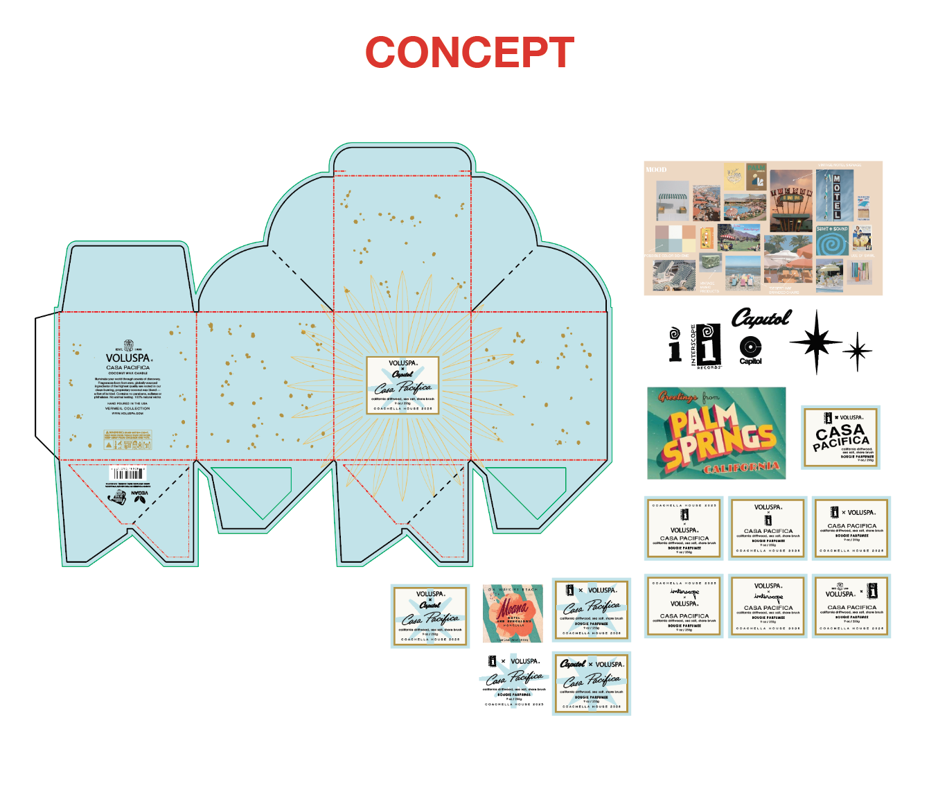 Working with our existing packaging and a quick turnaround time, created a custom coverup label to place on the front of our primary packaging that tied both brands, vintage colors, and the fragrance collection motif (the embossed star on the box). I focused on evolving our existing packaging rather than designing entirely from scratch, ensuring continuity while embracing the Coachella house theme. The final concept brought Voluspa’s iconic embossed star into the label, echoing vintage Palm Springs hotel iconography to create a nostalgic yet brand-aligned design.